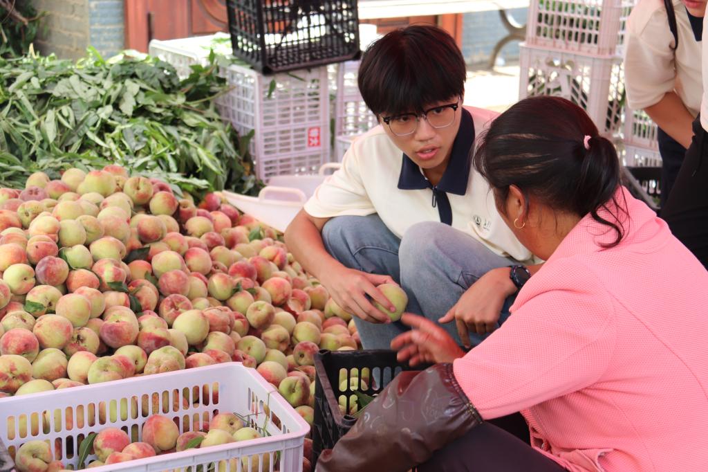 在普梯村村委会前的广场上,鲜桃交易正在如火如荼地进行中。在与当地果农的交流中队员们了解到,此时正是普梯村艳红桃收获的季节,每年的这个时候都会有来自全国各地的批发商来收购鲜桃,根据鲜桃的品相不同分装销售。在果农的指导下,实践队员亲身体验了鲜桃分装的过程。村支书郭成林介绍到:“鲜桃产业是普梯村的主要农业支柱,鲜桃品种主要有艳红桃和黄桃,在鲜桃成熟的季节,每日销售量超过三万斤,丰收时日产量能达到五万斤。” 郭书记的介绍,让队员们直观感受到特色产业对村民增收和乡村振兴的重要支撑作用。