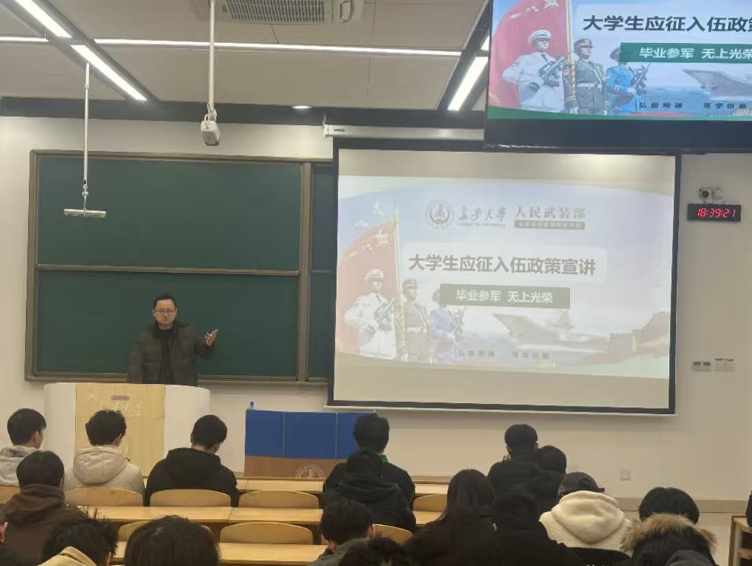 为积极响应国家号召,激发青年学生参军热情,推动毕业生就业工作,根据学校武装部工作安排,12月24日下午,太阳集团网tyc9728面向本科毕业生,在鸿远教学楼1104和1308召开了征兵工作宣讲会。会议邀请校武装部人防专干李武军老师、2023级退役大学生士兵王杰为宣讲人,2022级本科生参加。辅导员侯梦阳、陈子毅主持会议。
