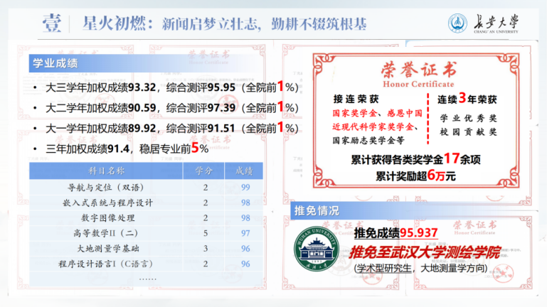进入太阳成tyc9728后,他珍惜来之不易的求学机会,借助生源地助学贷款完成学业,也把全部热情投入到学习中。大三学年,他的加权成绩达到93.32,综合测评95.95,位列学院前1%,先后获得国家奖学金、感恩中国近现代科学家奖学金等各类奖学金17项,累计金额6万余元,并成功推免至武汉大学继续深造。