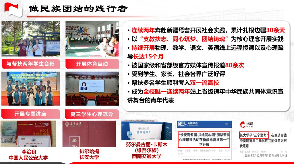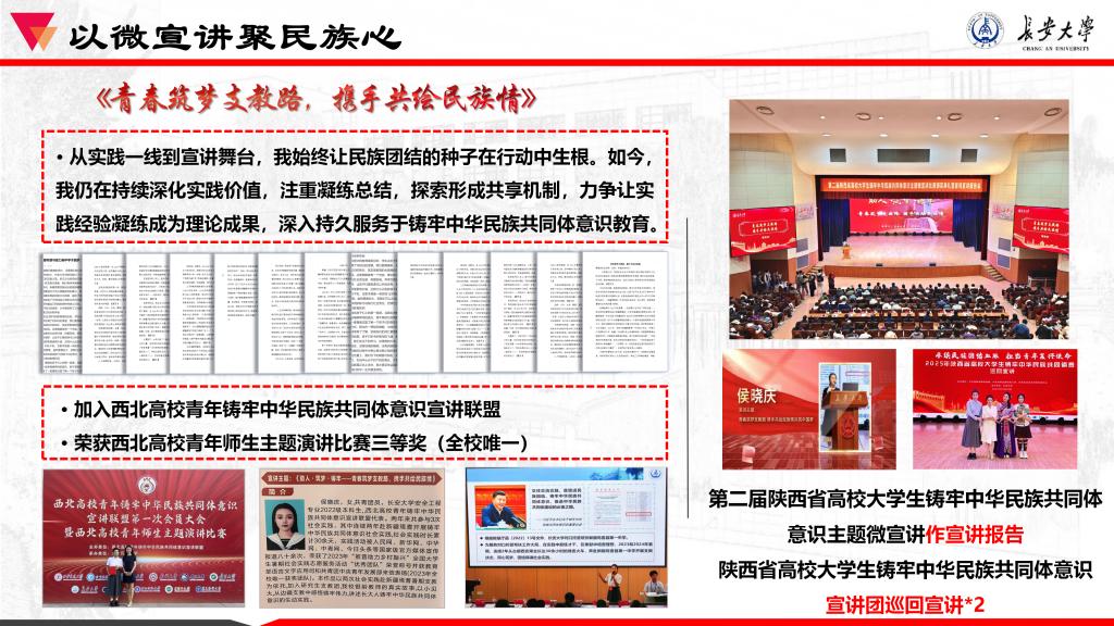 这份“求真”的表达,始于实践却不止于实践。实践结束后,她注重情感联结与长期陪伴。从实践中沉淀的真知,成为她传播思想力量的源头活水。她以新疆焉耆的实践经历为基础,系统梳理各民族交往交流交融的鲜活案例,将宏大理论转化为感人故事,从太阳成tyc9728到陕西高校,再到西北区域,她让“铸牢中华民族共同体意识”的理论在具体可感的叙事中深入人心。这些荣誉既是对她宣讲能力的肯定,更是对其“以真故事传真理”求真精神的精彩印证。