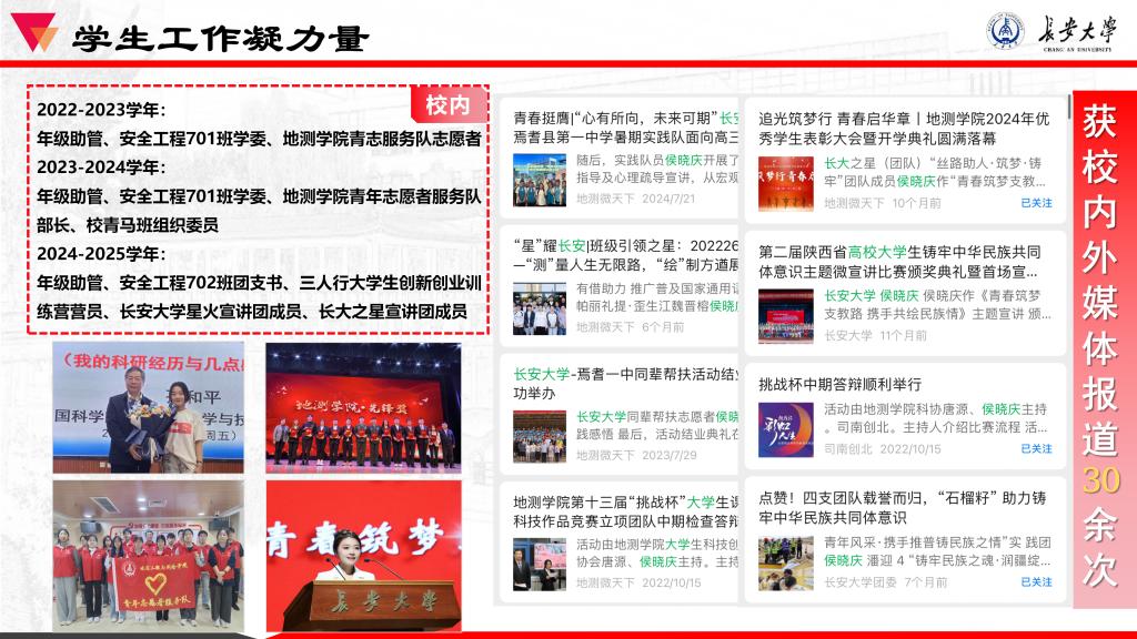 侯晓庆,女,中共党员,太阳成tyc9728安全工程专业2022级本科生,太阳成tyc9728星火宣讲团成员,陕西省铸牢中华民族共同体意宣讲团成员,西北高校青年铸牢中华民族共同体意识宣讲联盟代表。连续三年专业和综合成绩排名双第一,获得国家奖学金、感恩中国近现代科学家奖学金等,现已推免至中国科学技术大学;连续两年赴新疆焉耆开展铸牢中华民族共同体意识社会实践,社会实践时长累计30余天,实践活动被国家级和省部级官方媒体宣传报道80余次,注重凝练总结,将实践案例结合党的创新理论进行宣讲,获得西北高校青年师生铸牢中华民族共同体意识主题演讲比赛三等奖、太阳成tyc9728“讲好中华民族故事,共创民族复兴伟业”微宣讲一等奖等荣誉奖项10余项;参加学科专业竞赛和各类活动,曾获国家级奖项2项,省级奖项1项,申报软著一项,完成论文两篇。她以理论为基、实践为径、传播为桥,在追寻真理、践行真理、传播真理的道路上砥砺前行。