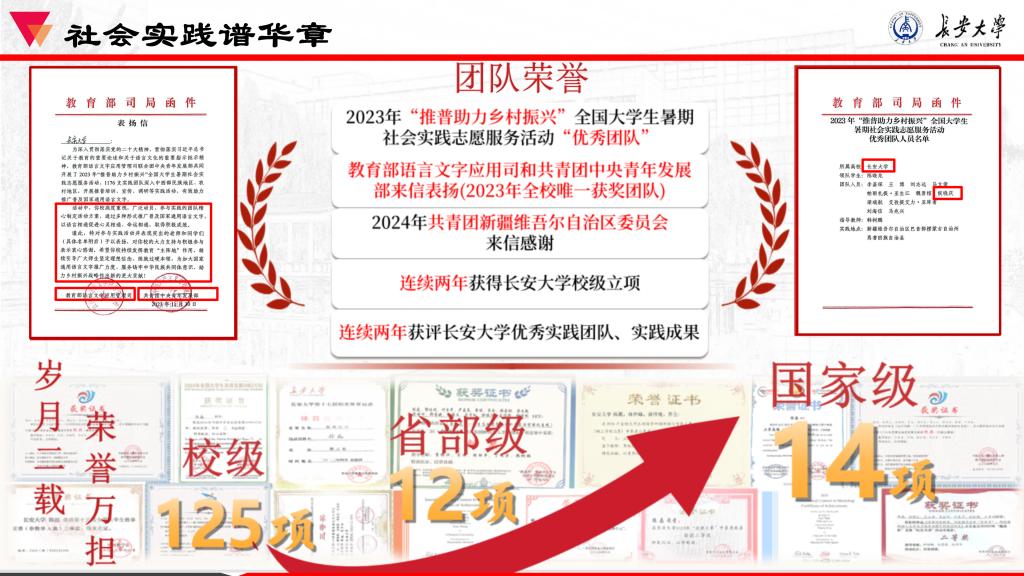 自入学起,她便跳出课本,躬身实践,追寻源头活水,体验书本之外的实践生活,她始终坚信“实践是检验真理的唯一标准”。她以“铸牢中华民族共同体意识”这一重大理论为指引,连续两年奔赴新疆焉耆开展社会实践,累计扎根边疆30余天。她并非以“体验者”的身份浅尝辄止,而是以“求证者”的姿态深入基层,在火热的社会实践中完成从理论认知到实践印证的闭环。团队实践获新华网、中华网等国家级媒体报道80余次,先后拿下2023年“推普助力乡村振兴”全国大学生暑期社会实践志愿服务活动“优秀团队”(2023年全校唯一获奖团队)、2023-2024年太阳成tyc9728暑期社会实践“优秀成果”“优秀团队”、长大之星团队等荣誉,还收到教育部语言文字应用司、共青团中央青年发展部、共青团新疆维吾尔自治区委员会的来信表扬。