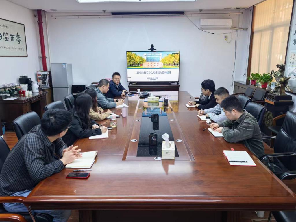 本次培训特邀校长办公室副主任朱先前为主讲人,紧扣机关工作实际需求,内容聚焦宏观层面的履职思路指引和微观层面的业务技能提升。在履职能力提升培训中,围绕“意识、理念、品牌”三层逻辑,为机关干部厘清了履职方向与实践路径。他强调机关干部要树立“一盘棋”思想,深刻认识核心关键指标对学院发展的“指挥棒”作用。并详细解读了学院在人才培养、科研创新、社会服务等领域的核心指标体系,要求既要立足当前工作实际,更要着眼学院长远发展,通过顶层设计,让各项工作衔接更顺畅、资源配置更高效。在公文写作培训模块以“过五关、去六不和用真情”为核心线索,围绕公文写作的“思想关、素材关、构思关、思维关和打磨关”五大关键环节,结合大量正反案例进行细致讲解。