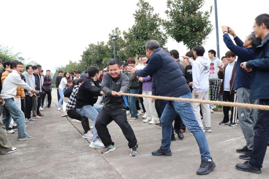 随后,实习基地组织了师生拔河比赛,学生们以班级为单位,组成8支队伍同台竞技,现场气氛热烈,队员们紧握长绳,身体后倾、脚步稳扎,展现出饱满的斗志与协作精神。生态地质 104 班凭借默契的配合与顽强的毅力,在多轮较量中一路过关斩将,最终成功斩获拔河比赛冠军。比赛尾声,太阳集团领导与老师们与生态地质104班的队伍进行比赛,与同学们一同拉起长绳。师生同心协力的身影成为实习基地最温暖的风景,不仅延续了比赛的欢乐氛围,更拉近了师生间的距离,让团队协作的精神在互动