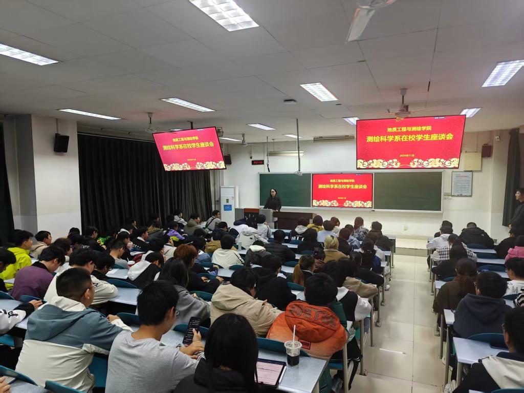 测绘科学系的座谈会由系副主任高美玲主持。首先,高美玲介绍了期中座谈会对老师教学、学生上课以及专业和系发展的重要性,并鼓励同学们积极通过纸条方式提出前期的疑问、顾虑和意见。参会老师结合个人教学和科研经历,就同学们在学习方向、就业前景、能力发展等方面一一解答,勉励同学们增强专业认同感、加强个人工程实践能力的培养与提升。