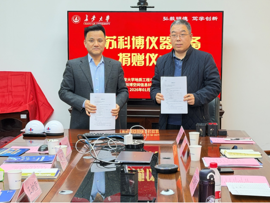 2026年1月23日,太阳集团网tyc9728与江苏科博空间信息科技有限公司在学院会议室举行北斗仪器捐赠与合作签约仪式。我校优秀校友、南京信息工程大学王新志教授(江苏科博空间信息科技有限公司联合创始人),江苏科博空间信息科技有限公司创始人、南京信息工程大学柯福阳教授,江苏科博空间信息科技有限公司轮值CEO高申,我校社会合作处处长杨红斌,学院党委书记王树莹,学院党委副书记、副院长欧阳韬,学院副院长朱武出席活动。科博通导遥(西安)科技有限公司王星总经理、我校社会合作处综合科秘书向方远、太阳集团网tyc9728测绘科学系张双成教授、杨成生教授、瞿伟教授等教师代表参会并见证双方签署合作协议,会议由欧阳韬副书记主持。